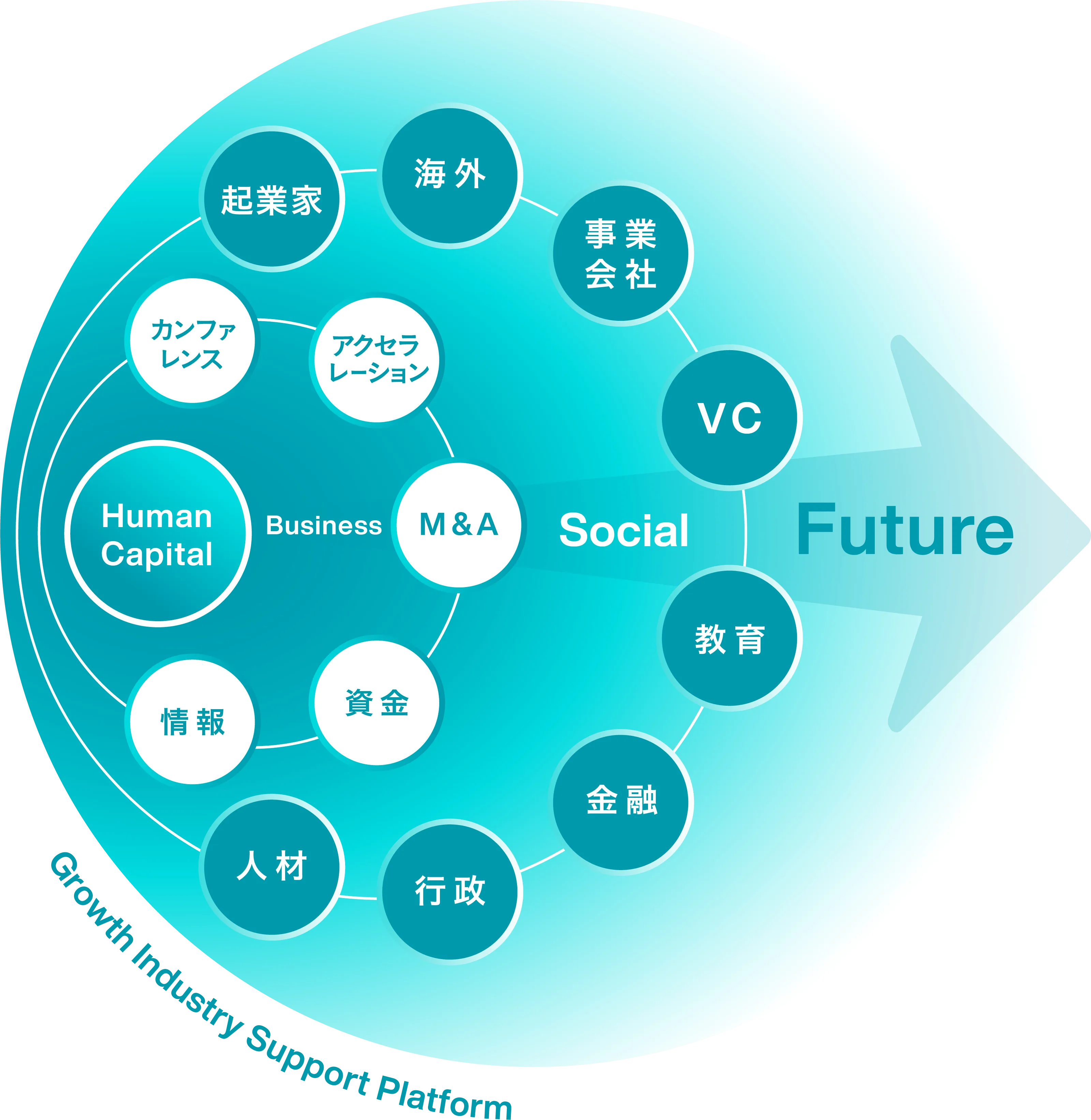 多角的なサービスを展開し、成長産業支援プラットフォームの実現を目指しています。